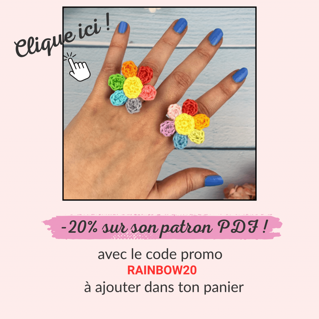 Je te partage dès maintenant ce patron crochet de la Bague fleur arc-en-ciel gratuitement ci-dessous et aussi en format PDF sur ma boutique si tu veux le garder avec toi !