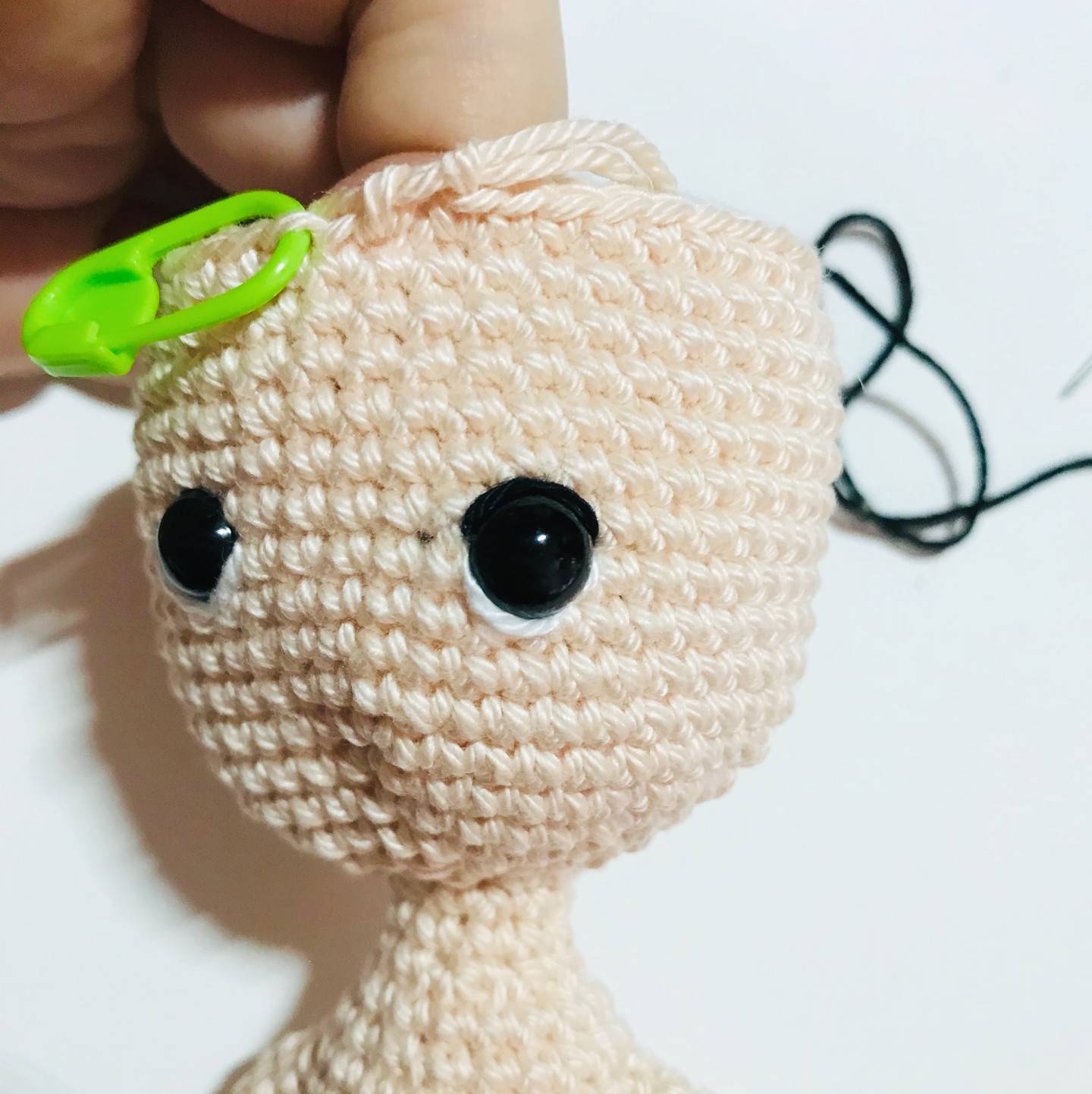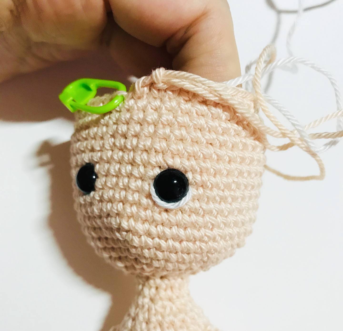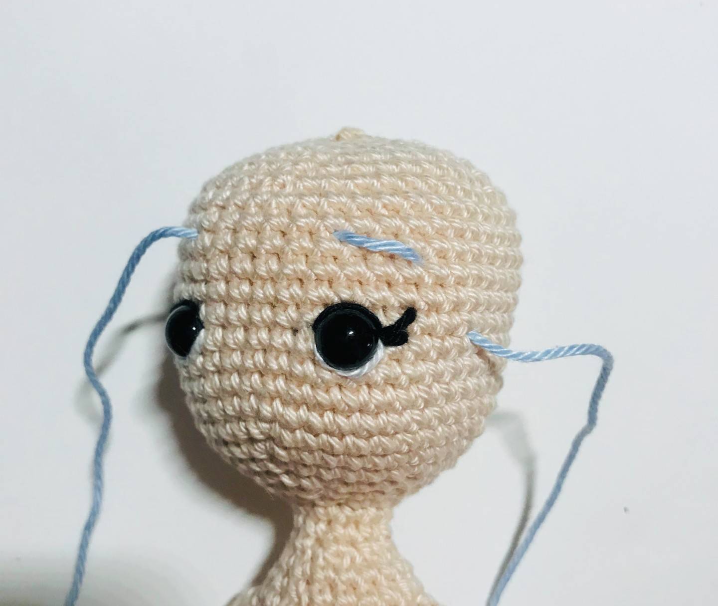 With light blue thread, pull it in to bring it out 3 rows above the eyes and 1 sc from the edge of the eye horizontally.