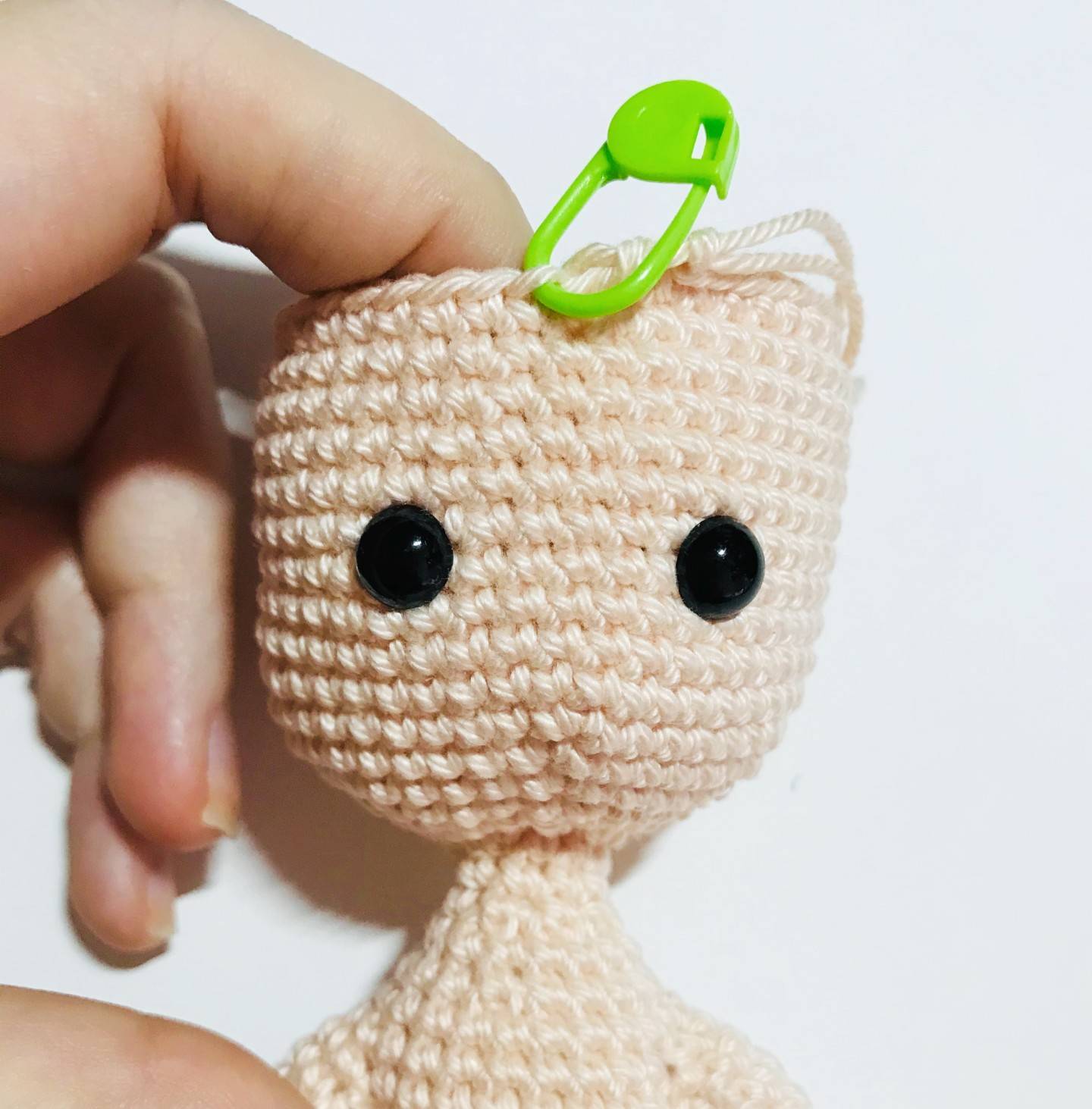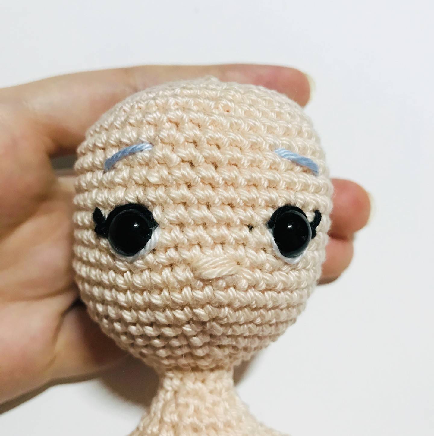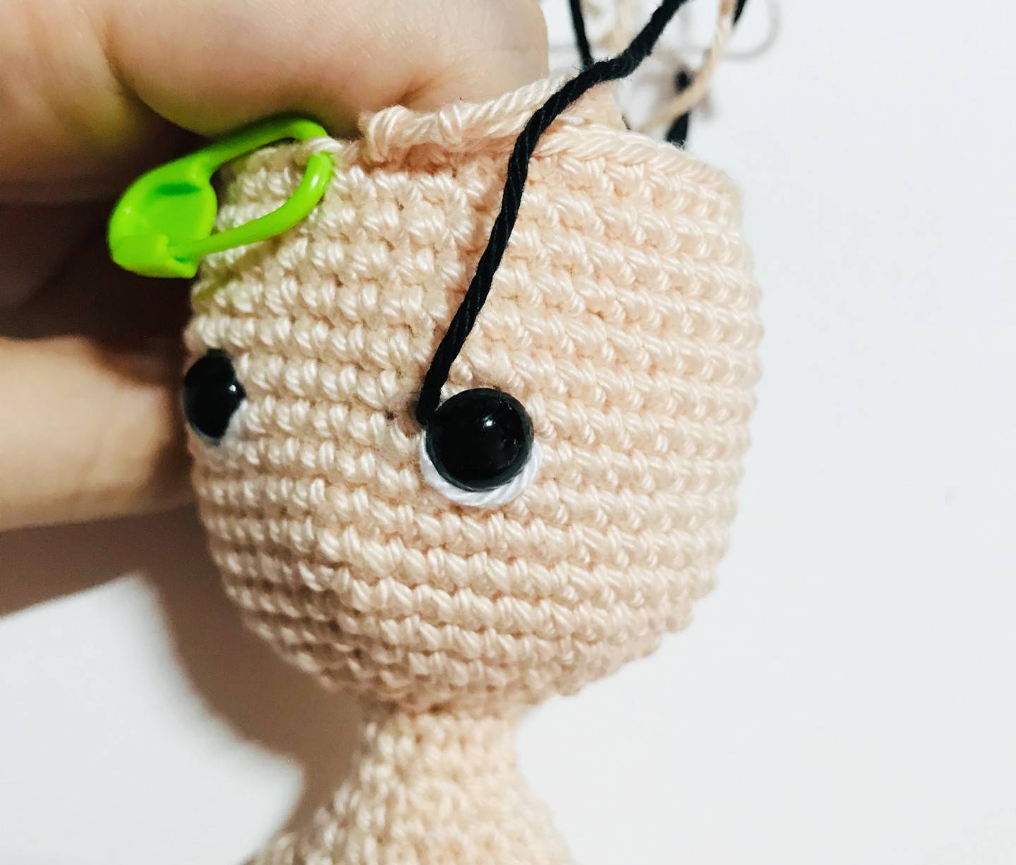 With light blue thread, pull it in to bring it out 3 rows above the eyes and 1 sc from the edge of the eye horizontally.