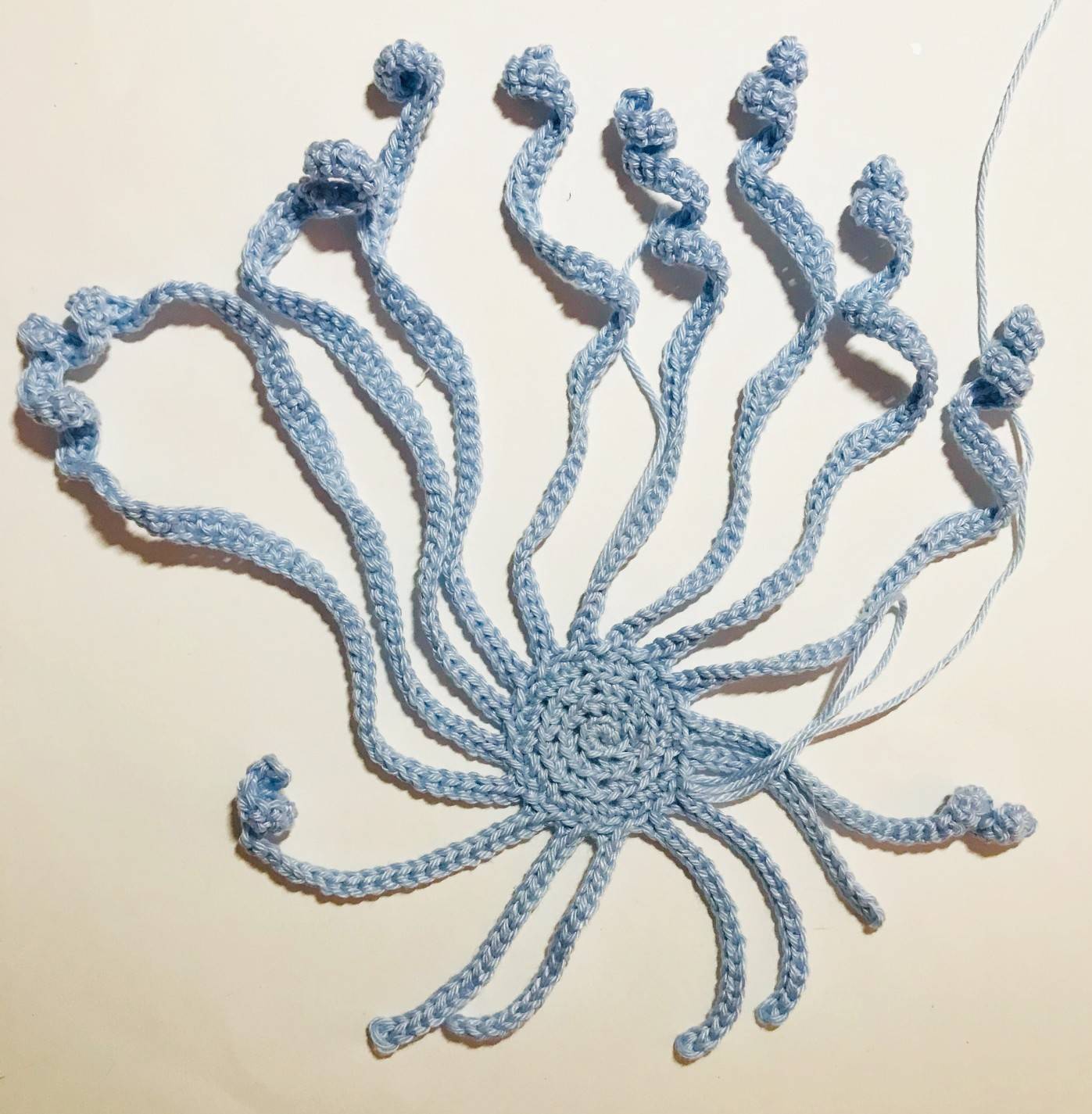 Strand 12: CH 32. from the 2nd stitch, 1 SlSt then 11 sc and 19 SlSt. Finish with 1 SlSt on the base by