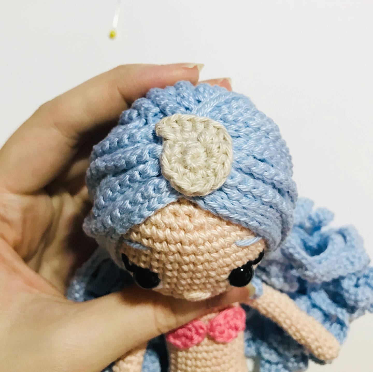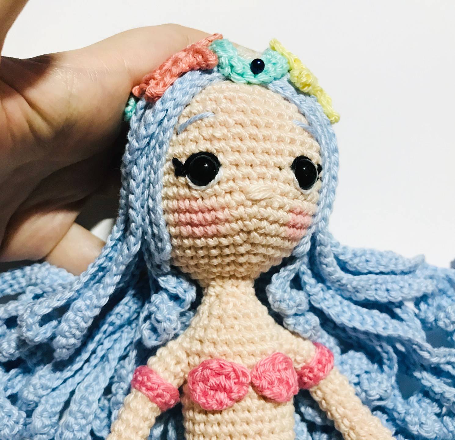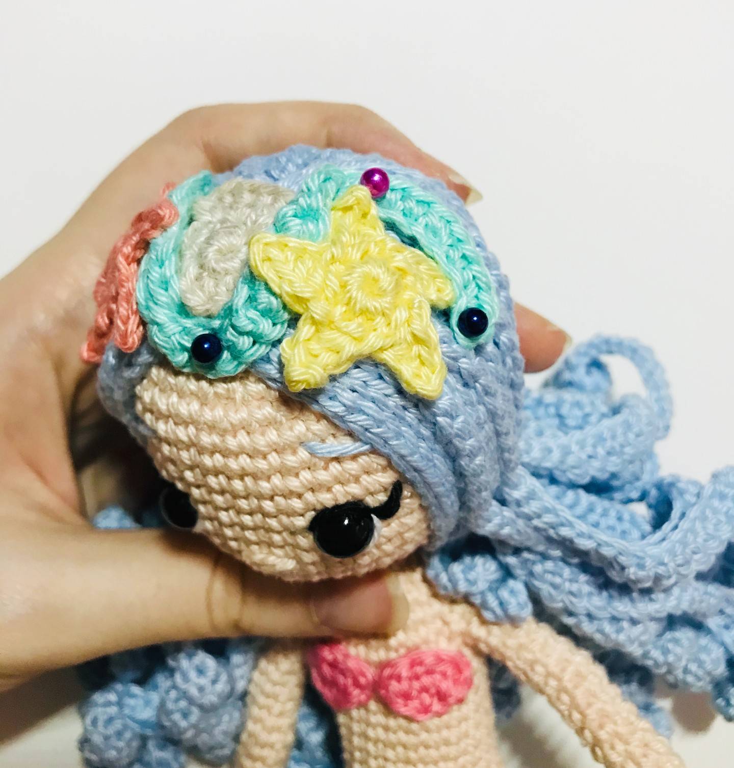 Today I present to you a pattern that smells of summer and the sea: Marea, the mermaid princess 🧜♀️. A mermaid with abundant hair that ripples in the water adorned with a sea crown composed of starfish, a shell and algae. With this new doll, I put the spotlight on the mermaids who are also part of the elementals such as fairies or unicorns.