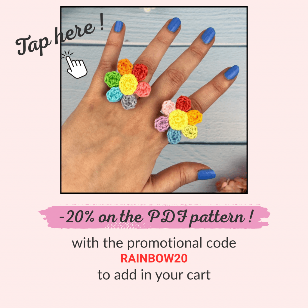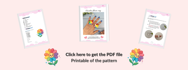 I’m sharing this crochet pattern of the Rainbow Flower Ring for free below and also in PDF format on my shop if you want to keep it with you!