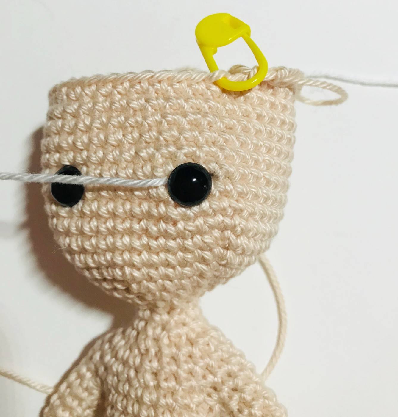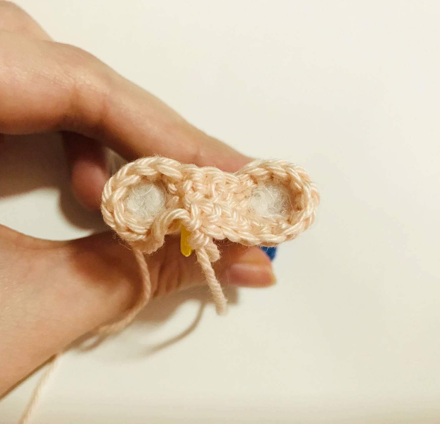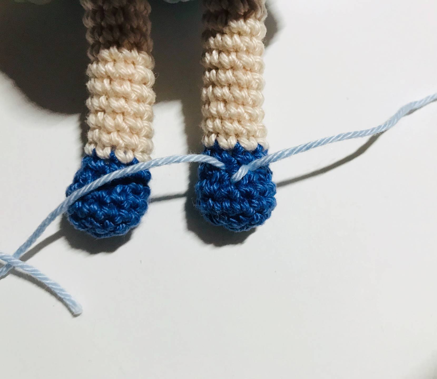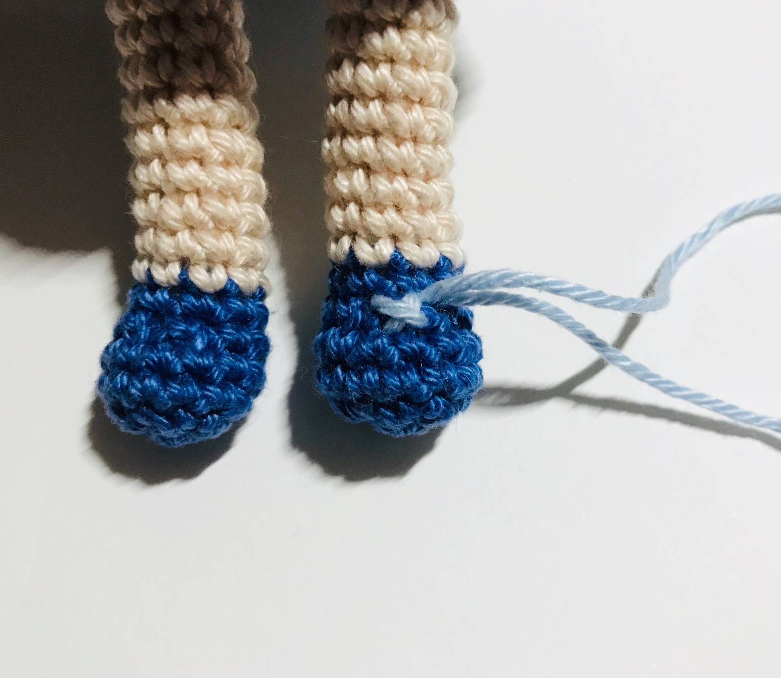 Couper et rentrer le fil pour l’une des jambes. Garder le fil avec la deuxième et continuer avec l’étape suivante ci-dessous.