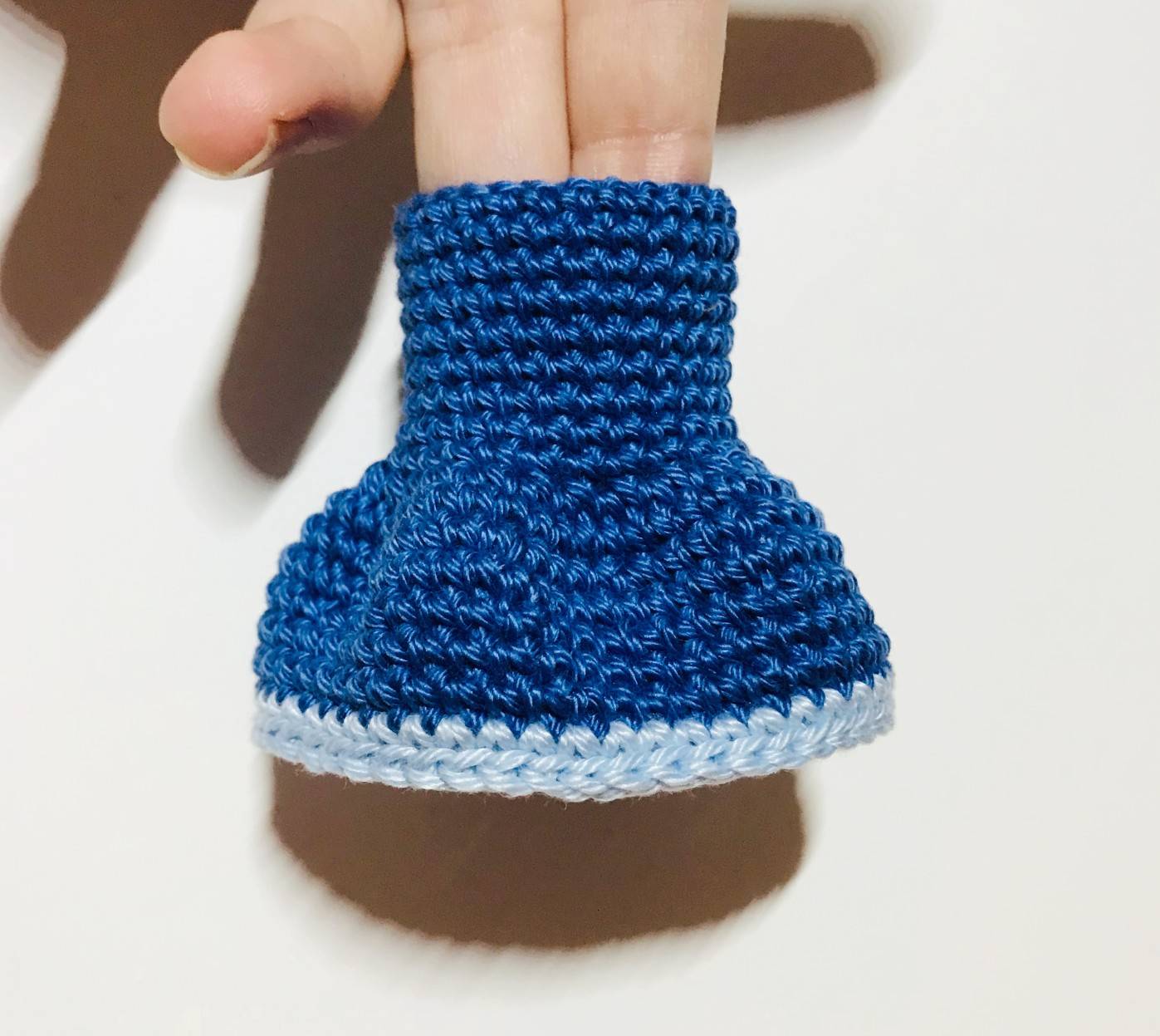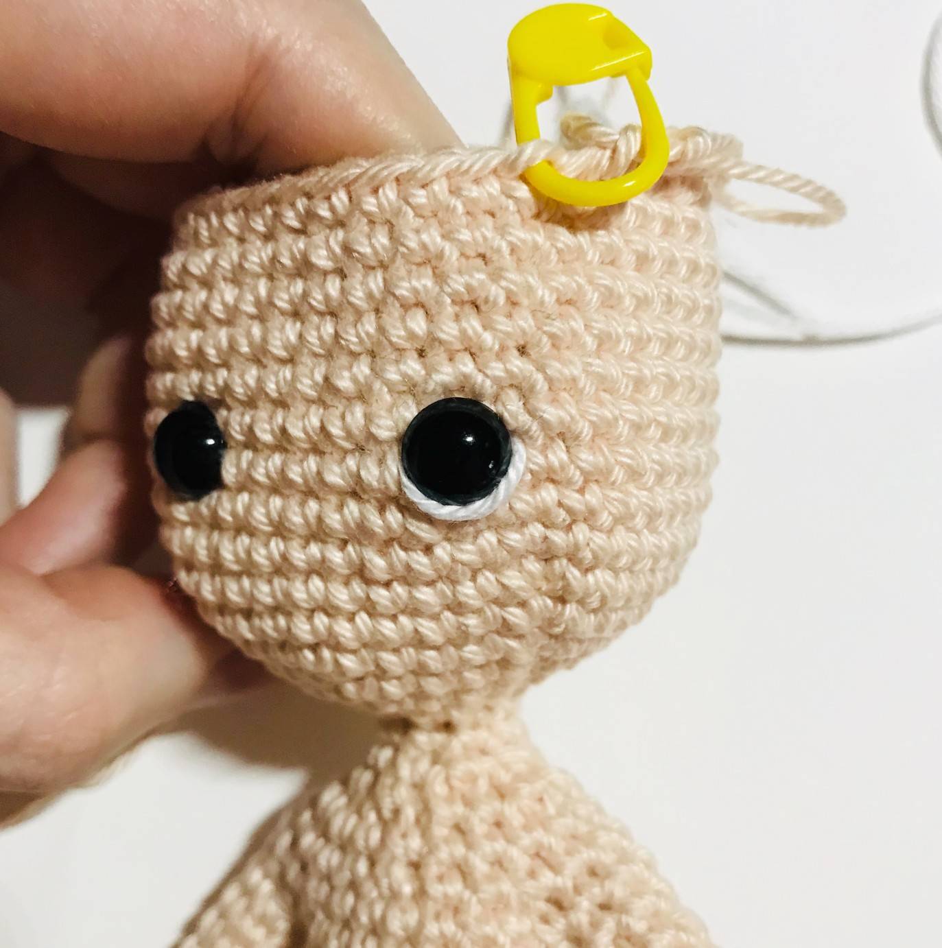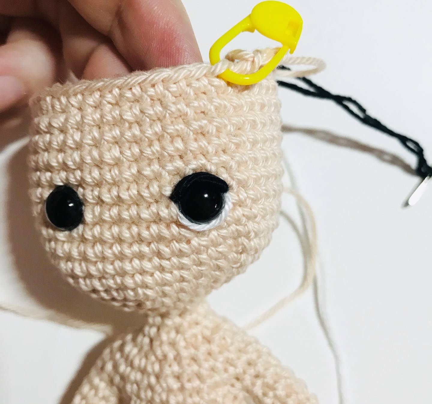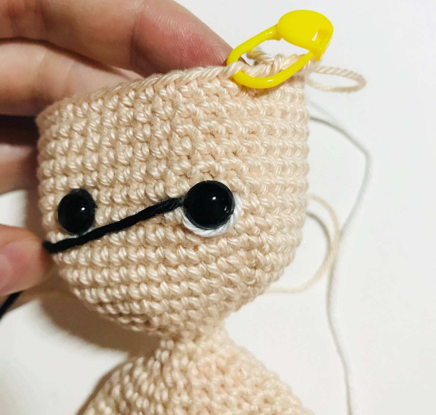 Couper et rentrer le fil pour l’une des jambes. Garder le fil avec la deuxième et continuer avec l’étape suivante ci-dessous.