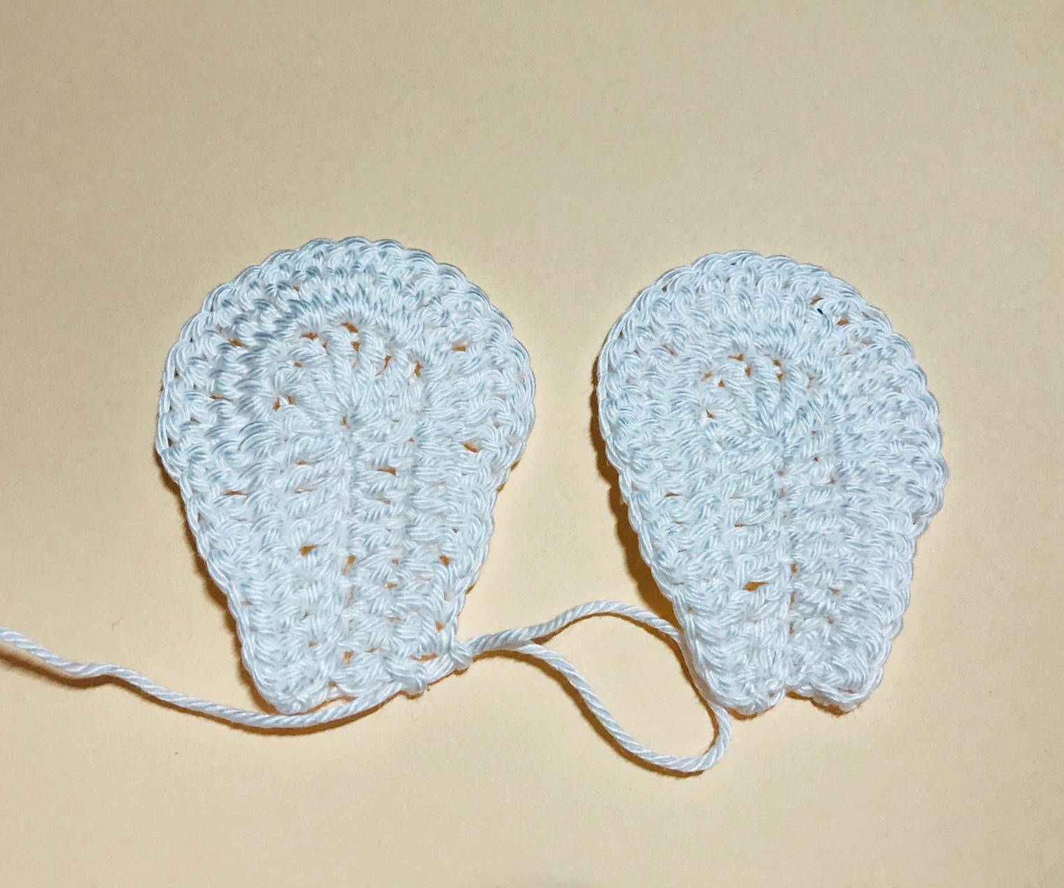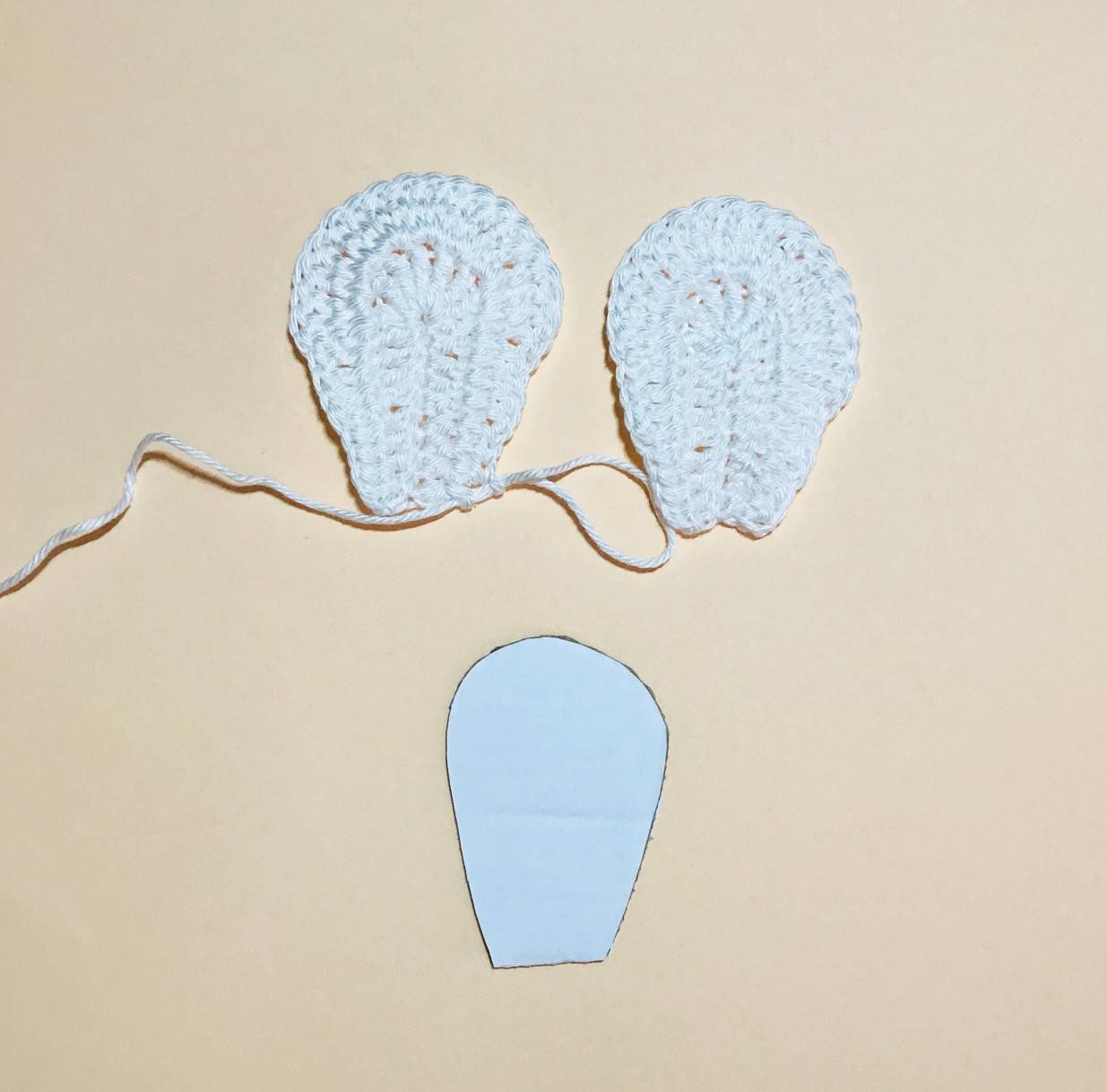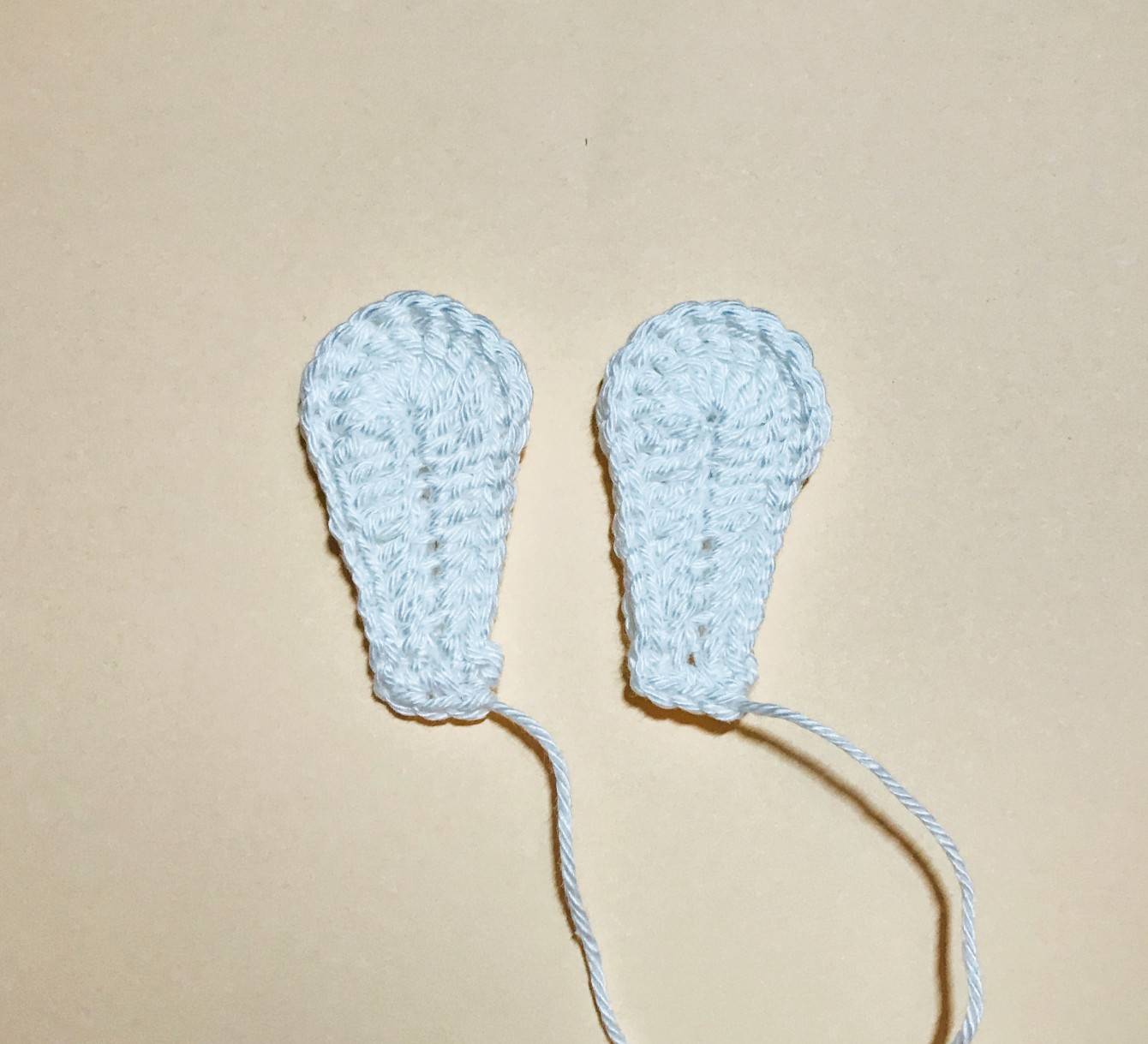 - Coudre la petite aile sur la grande aile juste sur le côté de la base qui est droit (les 4 ms). Puis la coller sur la grande aile sur la partie qui la touche sur la longueur pour bien la maintenir en