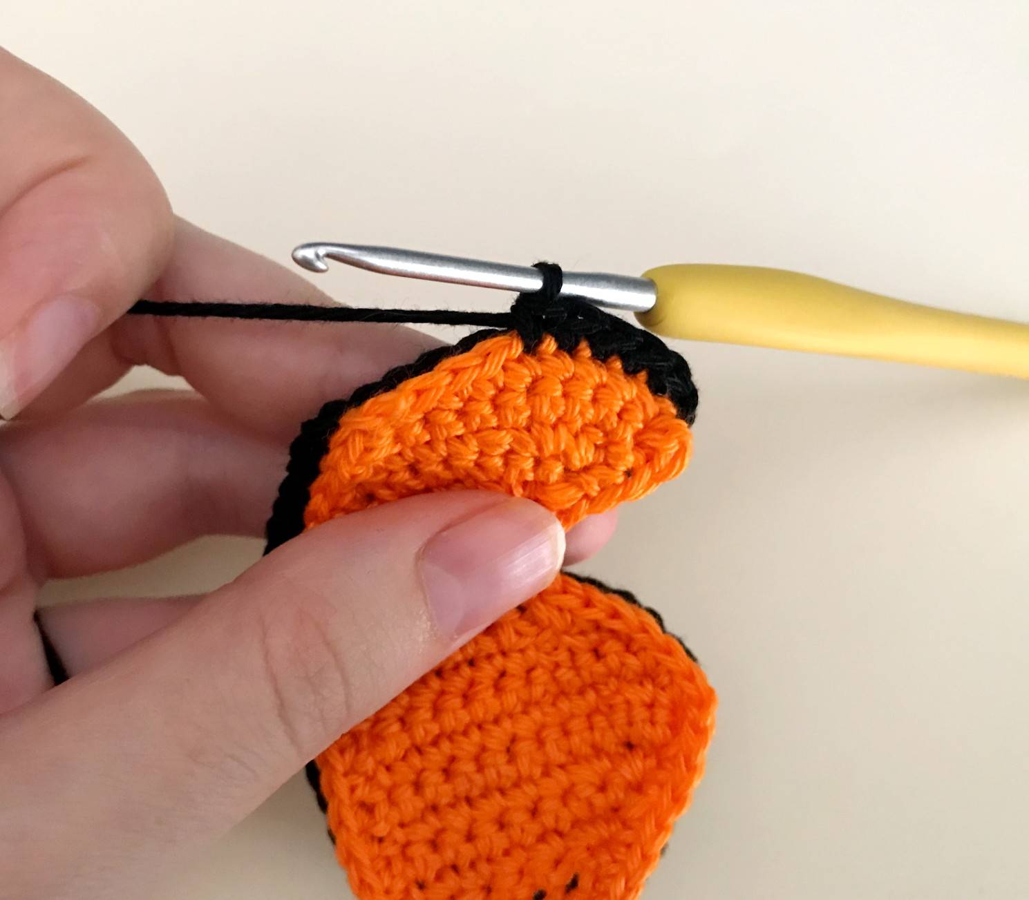 Continuer avec le fil pour faire le contour de l’aile avec des ms de la façon suivante: