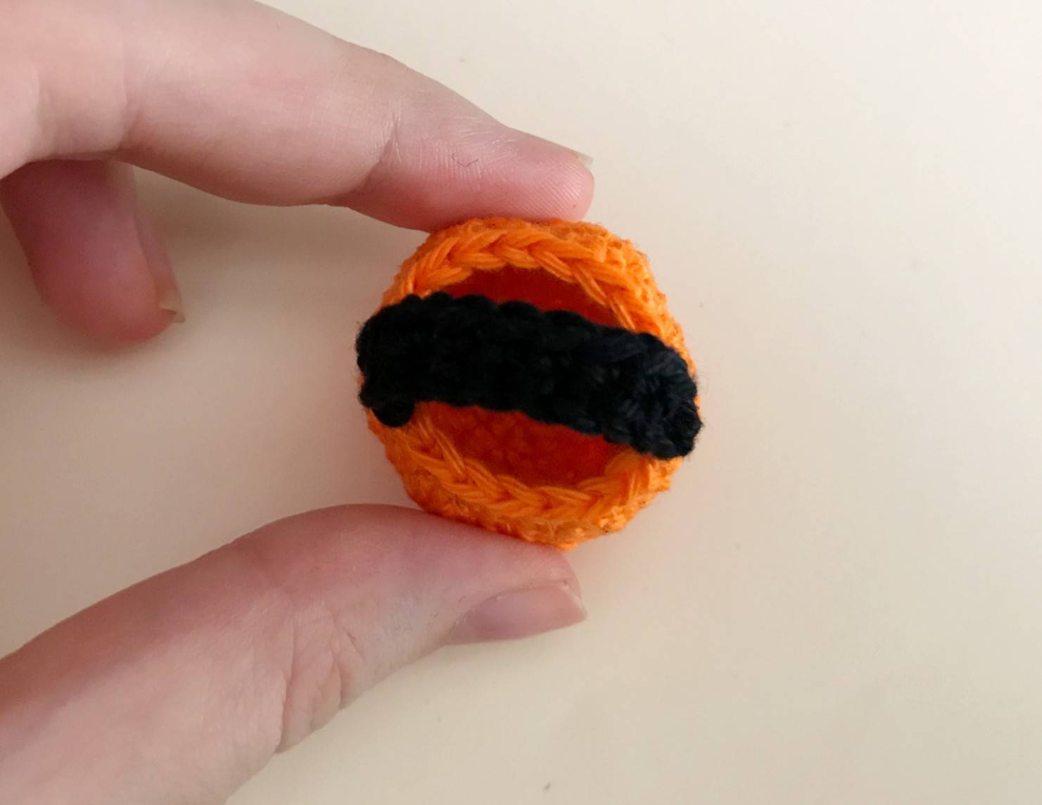1 ml, 17 ms, 1 ml, 5 ms, 1 ml, 6 ms, 1 ml et 13 ms (la maille en l’air correspond à chacun des angles et pointes).