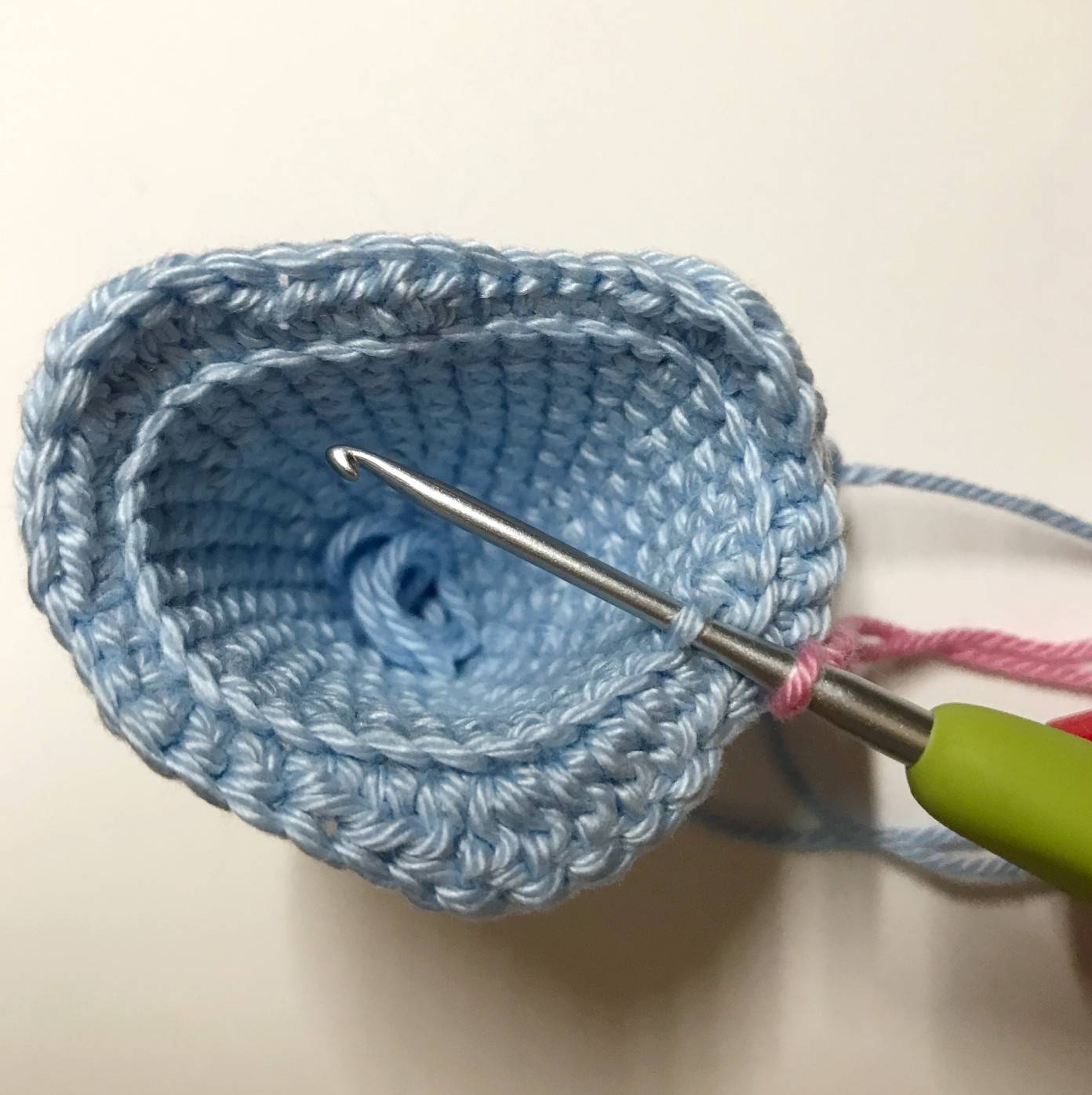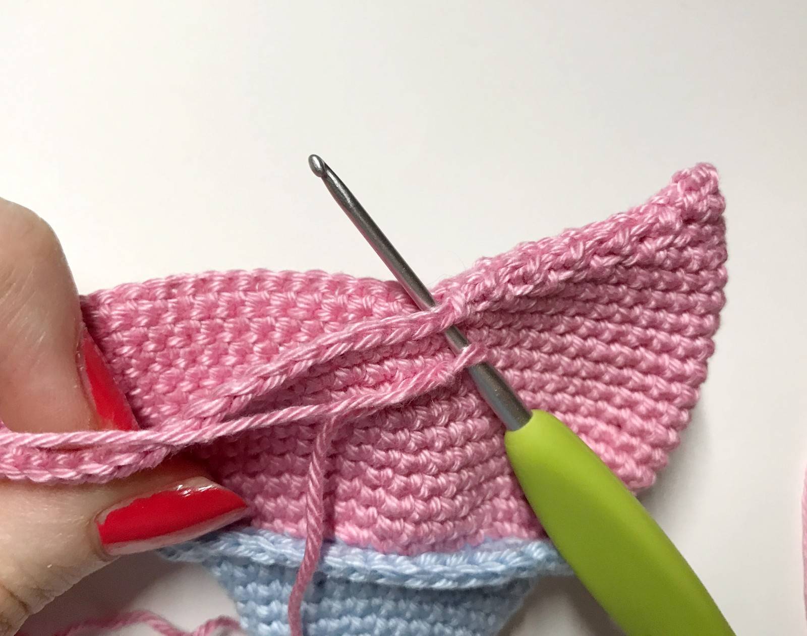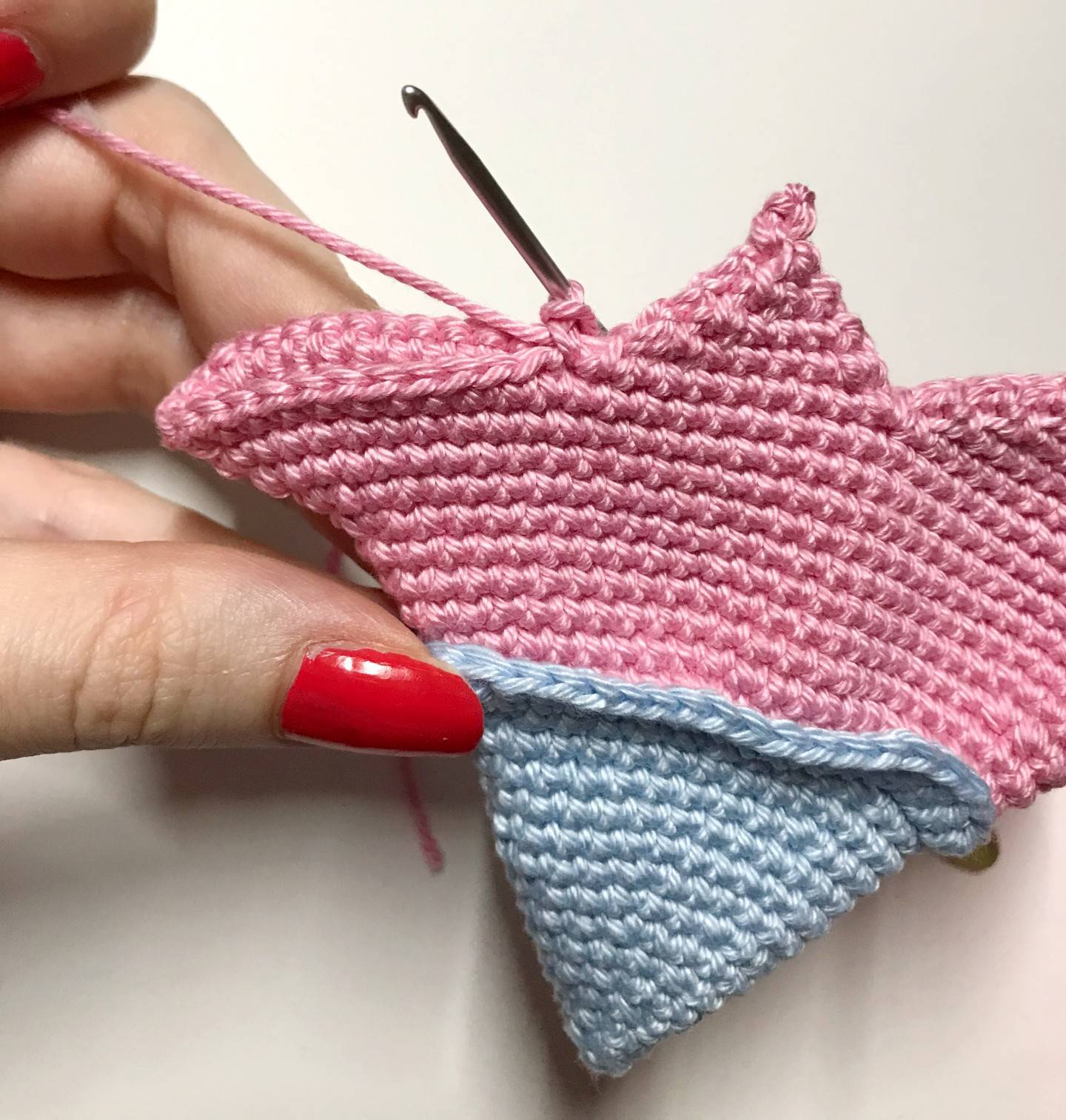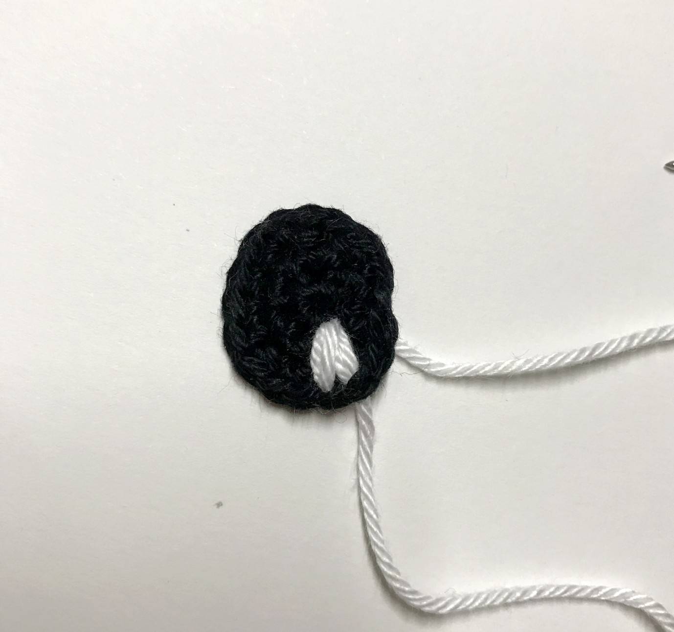 votre crochet pour faire 1 dms (voir astuce sur mon site) puis continuer avec 20 ms. Rejoindre les 2 côtés en faisant 1 ms avec la maille de départ en face (en rentrant votre crochet d’abord dans la maille d’en face) (21)
