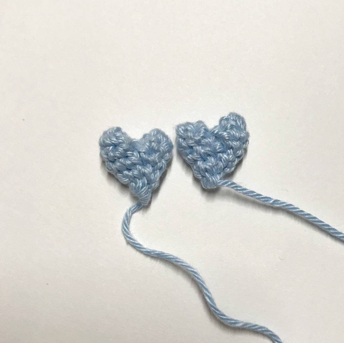 R3: Joindre les 2 monts avec 1 ms en prenant les 2 bords (en rentrant votre crochet d’abord dans la partie non reliée au fil puis dans la 2nde) puis une 2ème ms. Puis, continuer en faisant le tour des 2